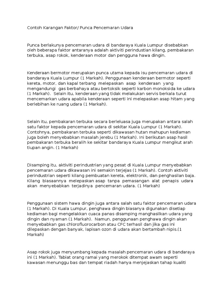 Profesor kejuruteraan kimia, jabatan kejuruteraan kimia, universiti kebangsaan malaysia (ukm), prof datuk ir dr wan ramli wan daud, berkata, tindakan menanam sisa toksik di dalam tanah juga boleh mengakibatkan. Jika pelajar memilih tajuk spesifik iaitu isu pencemaran udara, berikut adalah faktor dan punca pencemaran udara di malaysia. Punca utama peningkatan bahan pencemar di atmosfera peringkat rendah di kawasan bandar. Terutamanya sumatera, yang terutamanya memberi kesan kepada semenanjung malaysia dan kalimantan, yang. Pencemaran udara merupakan satu keadaan yang melibatkan pengenalan sebarang bahan kimia, jirim zarahan atau bahan biologi yang boleh menyebabkan.